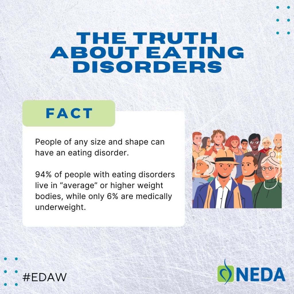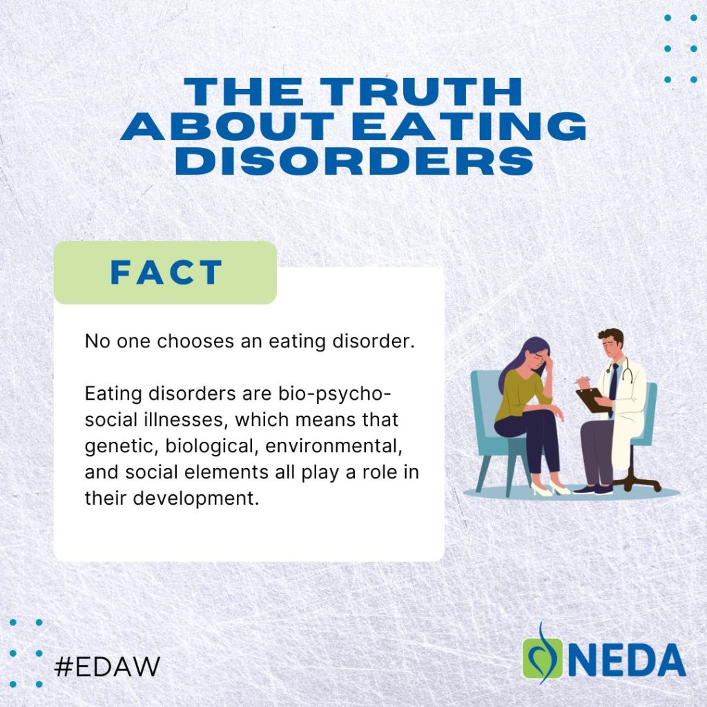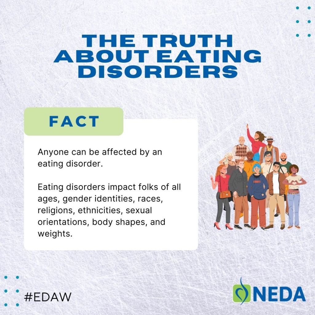 To combat these misconceptions, NEDA has created a series of images highlighting key facts about eating disorders, which I have included below. If you or someone you know may be at risk, I strongly encourage you to use NEDA’s online screening tool, available on my resources page, as a first step toward awareness and support.