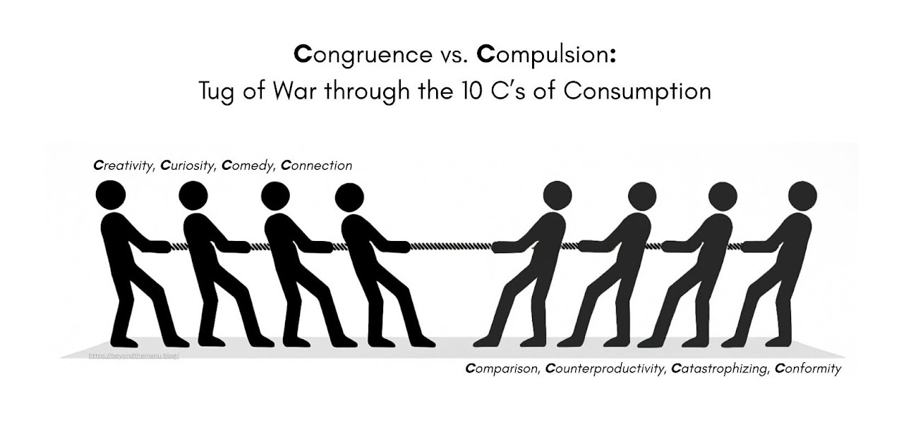 It’s easy to get caught in the game of what I define as “Tug of War through the 10 C’s of Consumption”—a model for identifying when what we’re consuming pulls us between what aligns with our authentic selves (congruence) and what draws us away (compulsion).