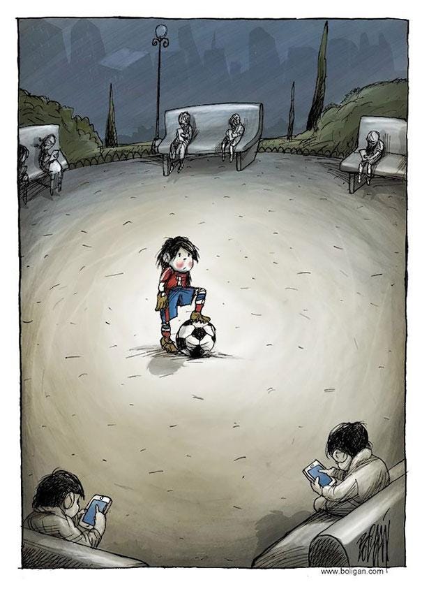 Illustration by Angel Boligán (www.boligan.com), capturing today’s playground reality, where our free time is drawn to the countless options offered in the digital world.